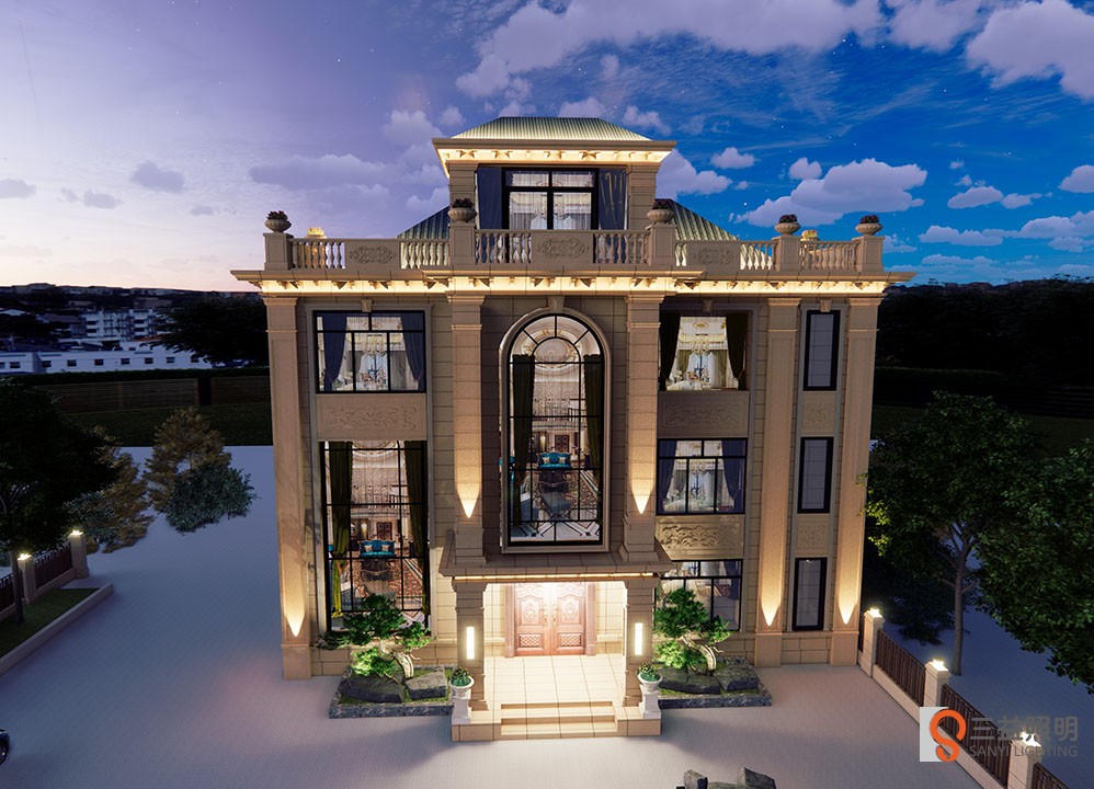 別墅燈光采用3D漫游設(shè)計(jì),燈具采用專業(yè)工程款瓦楞燈、洗墻燈、LED投光燈、定制柱頭燈、壁燈、草坪燈等,整體燈光營(yíng)造浪漫、溫馨的環(huán)境。